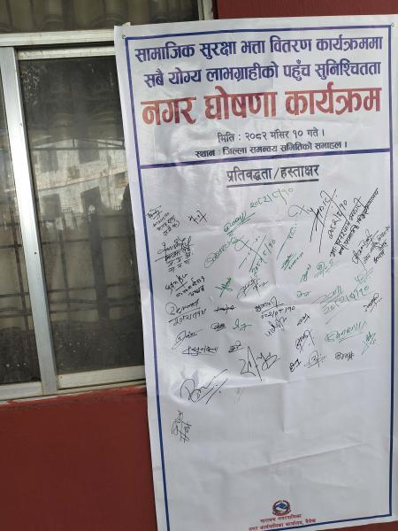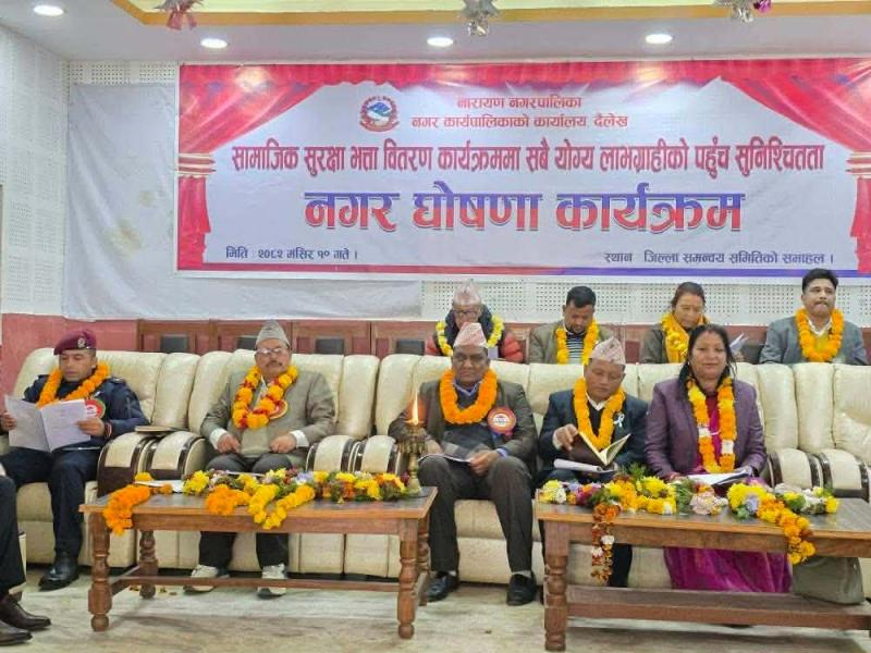नेपाल सरकारले व्यवस्था गरेको सामाजिक सुरक्षा भत्ताका लागि योग्य सबै लाभग्राहीहरुको पँहुच सुनिश्चित गर्न बनेको आधारभूत कार्यविधि २०८२ मा आधारित भएर नारायण नगरपालिका दैलेखलाई सामाजिक सुरक्षा भत्तामा शतप्रतिशत पँहुच सुनिश्चित गरिएको भनि यहि मंसिर १० गते घोषणा पनि गरिएको छ । सामाजिक सुरक्षा भत्ताका लागि योग्य भईकन पनि विविध कारणले सेवाबाट बाहिर रहेका वा भत्ता वितरण प्रणालीमा दर्ता हुन नसकेका व्यक्तिहरुको पहिचान, आवश्यक सहयोग र दर्ता प्रक्रियामा सहजीकरण गर्दै उनिहरुको पँहुच सुनिश्चित गर्नका लागि यस नगरपालिकाले आफ्नै कार्यविधि निमार्ण गरि वडा तथा समुदाय स्तरमा पूर्ण रुपले कार्यान्वयन गरेको छ । यसरी कार्यविधिको प्रयोग गरि ३८ जना योग्य तर छुटेका लाभग्राहीहरुको पँहुच सुनिश्चित गरिएकोछ । अब देखि थपिने नँया योग्य लाभग्राही बाहेर अन्य कुनैपनि व्यक्ति यस कार्यक्रमबाट छुटेका छैन भनि नगरपालिकाले औपचारिक रुपमै सुनिश्चित गरेको छ । र, आगामि प्रत्येक वर्ष ९कम्तिमा वर्षको एकपटक० यस नगरपालिकाले यसैगरि सबैको पँहुच सुनिश्चित गर्ने कार्य गर्नेछ । सामाजिक सुरक्षा भत्ता प्राप्त गर्न सबै आधारहरु पूरा भएपनि विविन्न कारणले अझैपनि केहि व्यक्तिहरु छुटिरहेका छन, सेवा बाहिर रहेका छन , स्थानीय सरकारको सहयोग र सहजीकरण आवश्यक छ भनि आवश्यकता महसुस गराउने, आवश्यक कार्यविधि तयार गर्ने, उक्त कार्यविधिको पूर्ण कार्यान्वयन गर्ने र शतप्रतिशत पँहुच सुनिश्चित भएको कुरा औपचारिक रुपमा घोषणा गर्ने प्रक्रियामा पहुँच परियोजना मार्फत निरन्तर प्राविधिक तथा अन्य आवश्यक सहयोग र सहजीकरण सहयोग उपलब्ध गराउने स्थानीय गैह्रसरकारी संस्था एभेरेष्ट क्लब दैलेख, र अन्तराष्टिय गैह्रसरकारी संस्था सेभ द चिल्डे«न ईन्टरनेशनललाई हार्दिक धन्यवाद । यस सम्बन्धि आधारभूत कार्यविधि २०८२ लाई पूर्ण रुपमा कार्यान्वय गरि नगरपालिकालाई नेपालकै पहिलो नगरपालिकाको रुपमा घोषण गर्न सफल बनाउनका लागि हरहिसाबले जीम्मेवारी पूरा गर्ने, भुमिका निवार्ह गर्ने, आवश्यकता अनुसार सहयोग गर्ने सबै वडाका वडा अध्यक्ष ज्यूहरु, वडा सदस्य ज्यूहरु, कार्यसमिति सदस्य ज्यूहरु, वडा सचिव ज्यूहरु, समुदायका स्वयमसेवक र समाजसेवी व्यक्तित्व, सामाजिक सुरक्षा शाखा तथा नगरपालिकाको सबै शाखा र कार्यालयमा कार्यरत सबै कर्मचारीहरुलाई धेरै धन्यवाद । कोहि नछुटुन कोहि नदोहोरिऊन भन्ने हाम्रो प्रतिवद्धता पूरा भएको छ । धन्यवाद ।